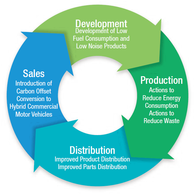 The KOBELCO CONSTRUCTION MACHINERY GROUP is carrying out various environmental conservation activities according to the business cycle of development, production, distribution and sales. Our efforts for environmental preservation include measures at each factory to reduce CO2 emission such as those to reduce energy use and waste matter, as well as production and development-related activities that focus on creating products with low fuel consumption and other improved environmental performance.