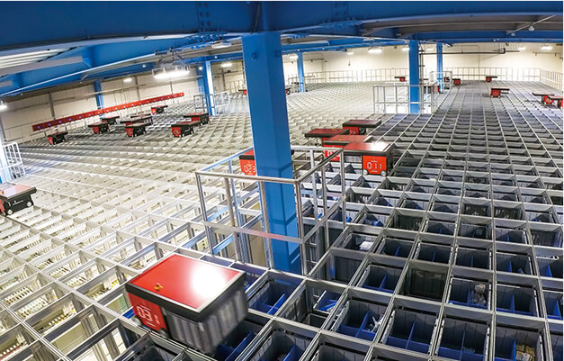 - ロボットカーがコンテナの出し入れを行う最新鋭の自動倉庫型ピッキングシステム。
