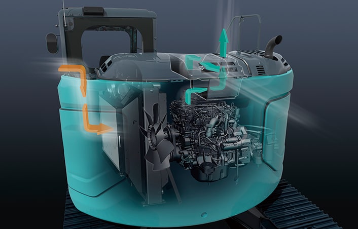 建設機械の振動や騒音を低減するためにコベルコ建機では(株)神戸製鋼所の研究チームとともにプロジェクトで独自の低騒音化技術「iNDr※」を開発しました。吸音材や廃棄ダクト配置の最適設計をおこない、エンジンと冷却ファンの騒音低減に取り組み、6年間の格闘の末、体感半分となる10dbの騒音低減に成功しました。街中でも人々の生活を妨げずに作業できるモデルを実現しています。