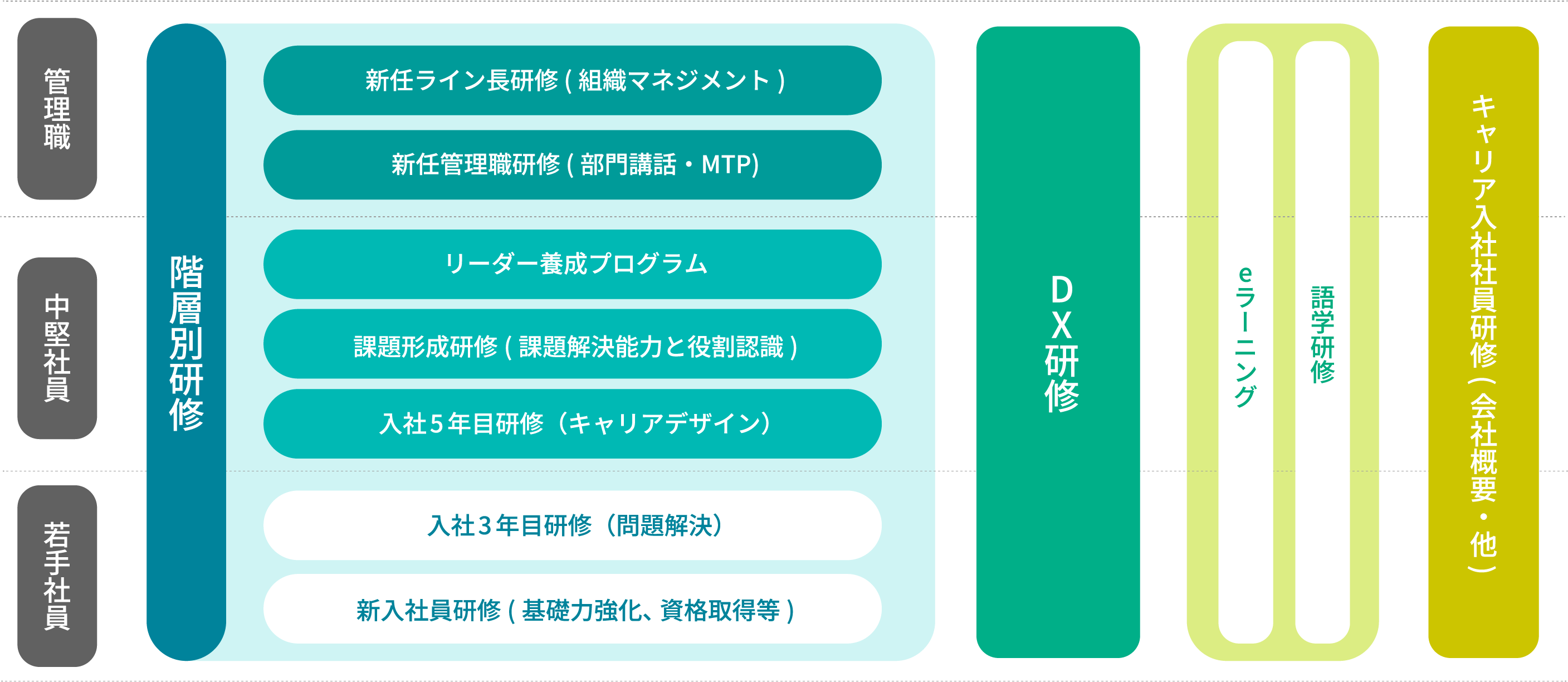若手~経営層にいたるまで、キャリア課題に応じた階層別研修を実施しています。若手・中堅は、自らの能力を高めることに主眼を置き、管理職以上は組織マネジメントや戦略策定などのトレーニングを行います。